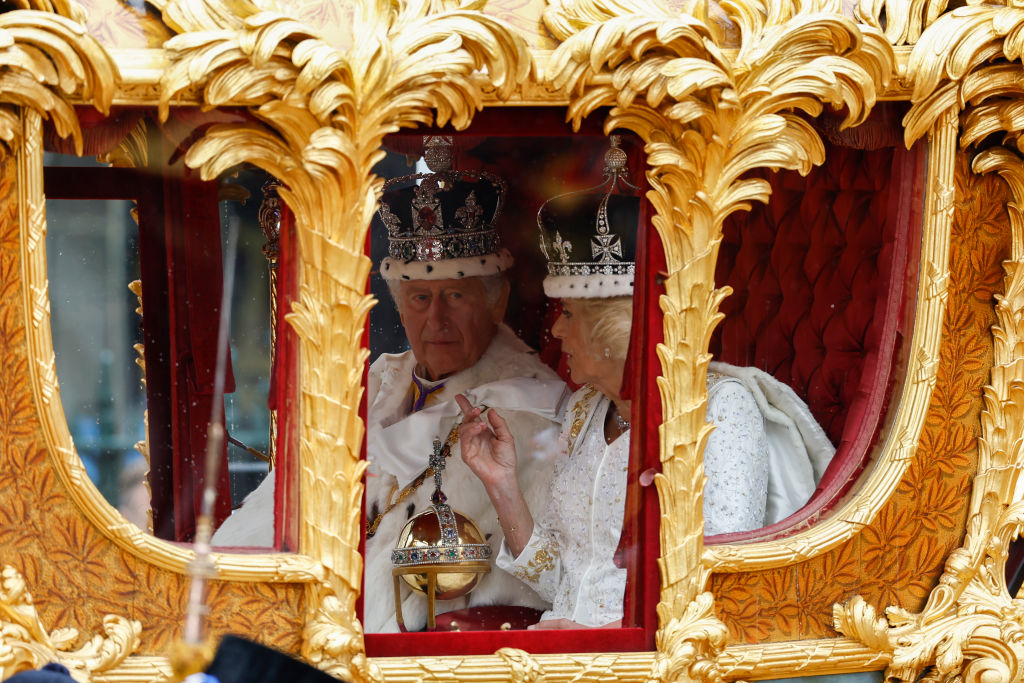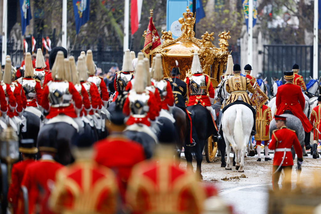 Μετά τη στέψη το βασιλικό ζεύγος επιβιβάστηκε στην Gold State Coach που κατασκευάστηκε το 1760  και έχει χρησιμοποιηθεί σε όλες τις ενθρονίσεις των βασιλέων της Αγγλίας από το 1831 μέχρι σήμερα. Η  άμαξα που θα μεταφέρει το βασιλικό ζεύγος στο ανάκτορο του Μπάκιγχαμ είναι εξαιρετικά άβολη όπως είχε διηγηθεί στο παρελθόν και η βασίλισσα Ελισάβετ. (Photo by Jeff J Mitchell/Getty Images/Ideal Image)