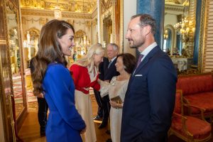 Στιγμιότυπο από την δεξίωση στο Μπάκιγχαμ: Η πριγκίπισσα της Ουαλίας συνομιλεί με τον πρίγκιπα Χάακον της Νορβηγίας. Στο βάθος διακρίνεται η Αικατερίνη της Σερβίας να μιλά με την σύζυγο του Χάακον, πριγκίπισσα Μέτε-Μάριτ.